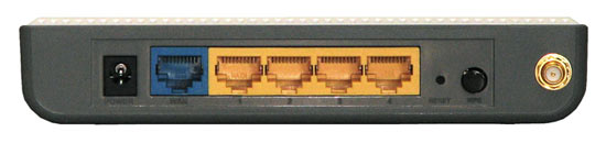 На задней панели ничего необычного – разъём питания, порт WAN, четыре порта LAN, утопленная в корпус кнопка сброса настроек, кнопка функции WPS и антенное гнездо.