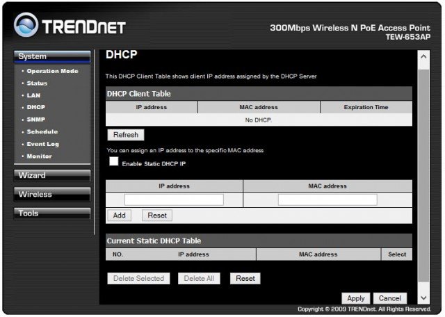 Встроенный в TRENDnet TEW-653AP DHCP-сервер имеет возможность привязки клиентов к MAC-адресам Static DHCP, что обеспечит резервирование за каждым устройством сети своего IP.