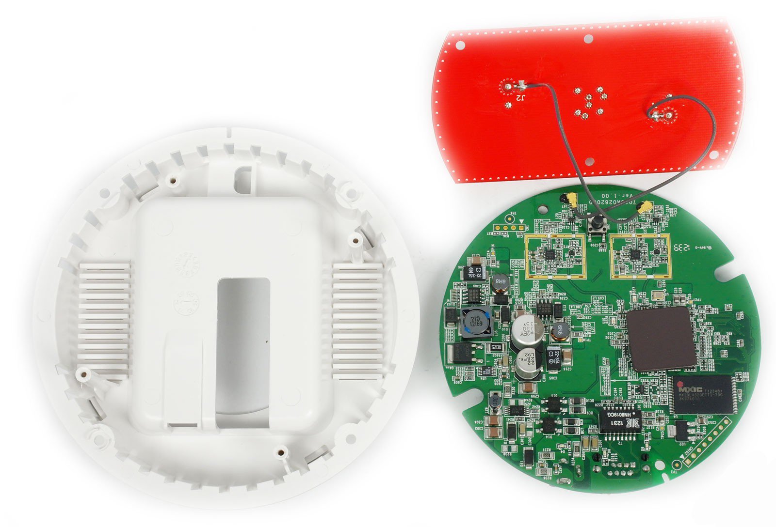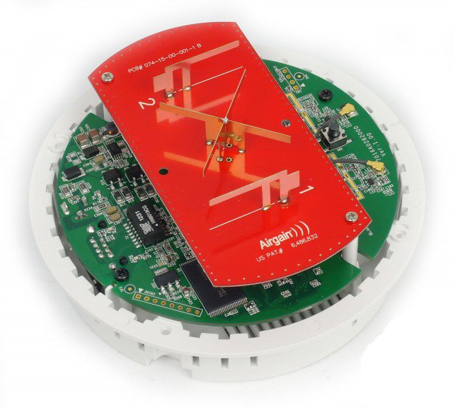 Стоит отметить особую потолочную конструкцию антенны компании Airgain с центральным крестом отражателей. Это позволит обеспечить максимальную производительность модели TRENDnet TEW-653AP при креплении её к потолку. Текстолит самой платы вполне соответствует корпусу: выглядит очень компактно и в то же время просто.