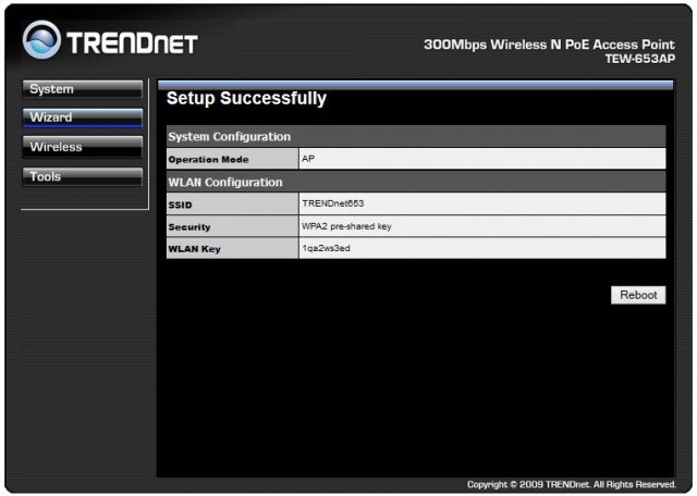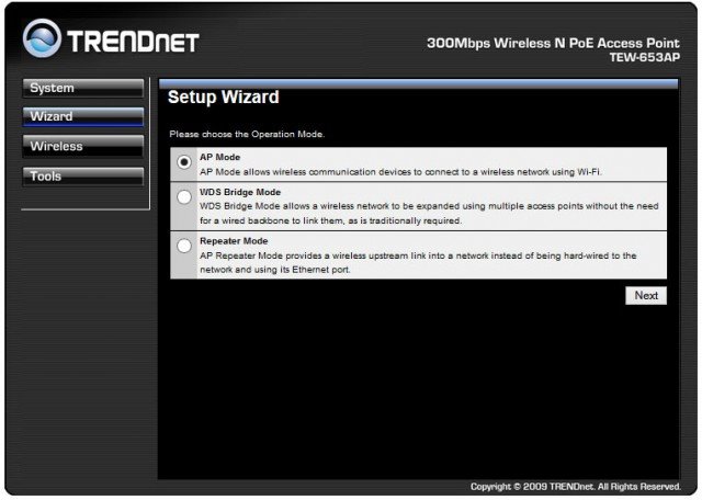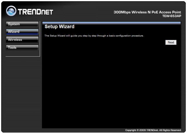 Подключение и конфигурирование TRENDnet TEW-653AP осуществляется с помощью WEB-мастера настройки, который на английском языке проведет вас через несколько простых шагов на пути к заветному беспроводному интернету.