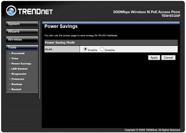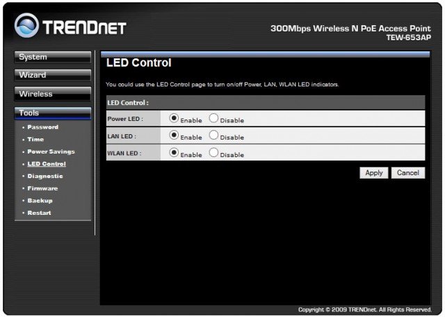 Интересной и, пожалуй, удобной функцией модели TRENDnet TEW-653AP станет возможность отключения индикаторов её работы - режим «стелс». Ведь не всегда удобно наблюдать при слабом освещении достаточно яркое синее моргание, которое исходит от устройства, расположенного под потолком.