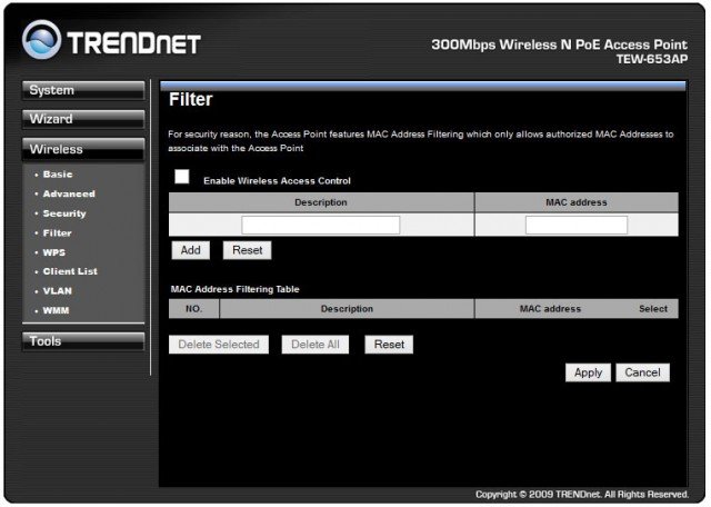 Модель TRENDnet TEW-653AP поддерживает ограничение доступа для подключения к ней и фильтрацию МАС-адресов пользователей. Можно создать списки физических адресов, для которых можно разрешить либо запретить доступ.
