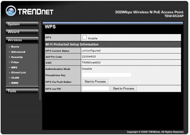 Включение и настройка режима WPS осуществляется в пункте «WPS». Этот режим позволяет подключать устройства по беспроводному каналу в одно нажатие кнопки. В этом пункте можно задать PIN-код доступа. После того как клиент, поддерживающий WPS-технологию, получит этот код, автоматически создается беспроводной канал связи.