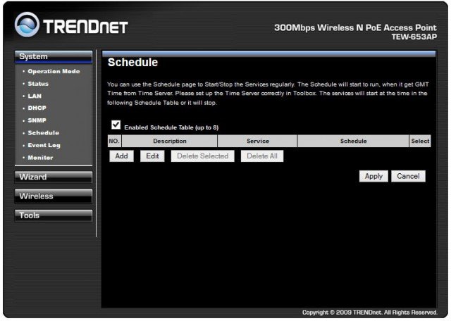 Также модель TRENDnet TEW-653AP поддерживает работу Wi-Fi сети по расписанию. Можно задать время включения и отключения.