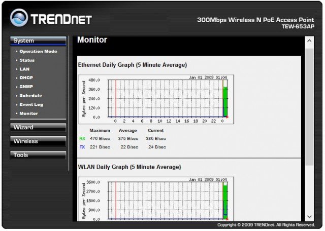 Хорошей и удобной особенностью модели TRENDnet TEW-653AP станет встроенная в неё возможность графического мониторинга загрузки сети, как проводного интерфейса, так и Wi-Fi канала.