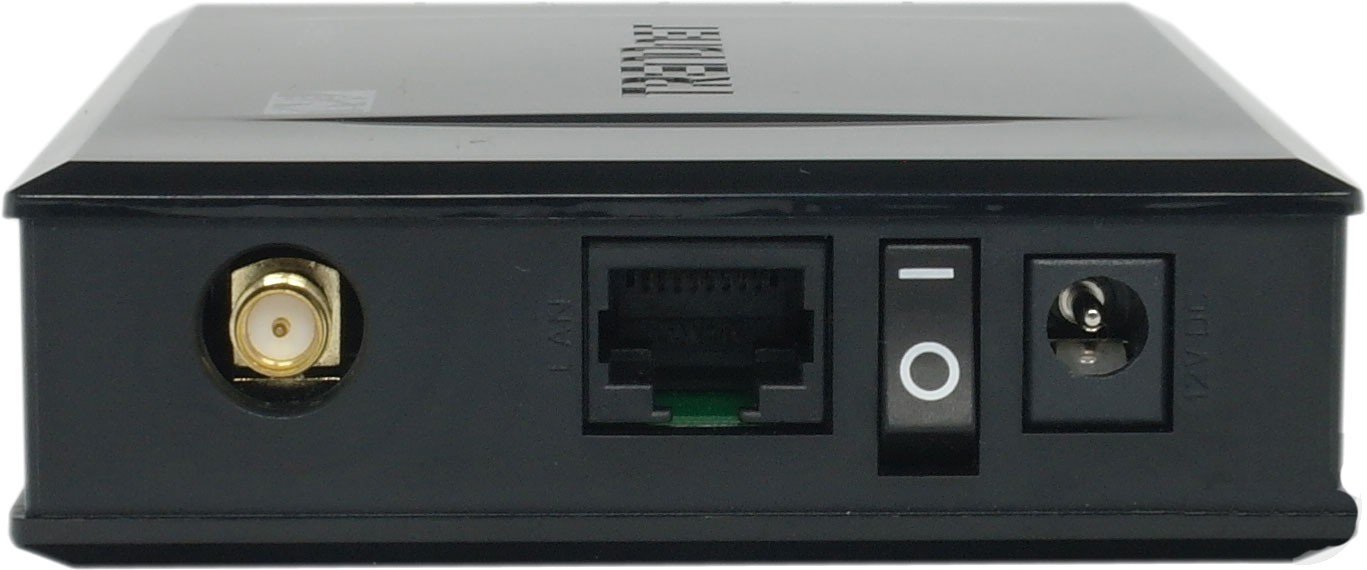 Рассматривая тыльную сторону точки доступа слева направо, в первую очередь видим гнездо подключения внешней антенны, затем коммуникационный разъем подключения сети Gigabit Ethernet. К нему требуется подключить домашнюю сеть или сеть предприятия, что позволит TRENDnet TEW-690AP выполнять функции точки доступа. Далее на задней панели следует кнопка отключения питания и разъем подключения блока питания.