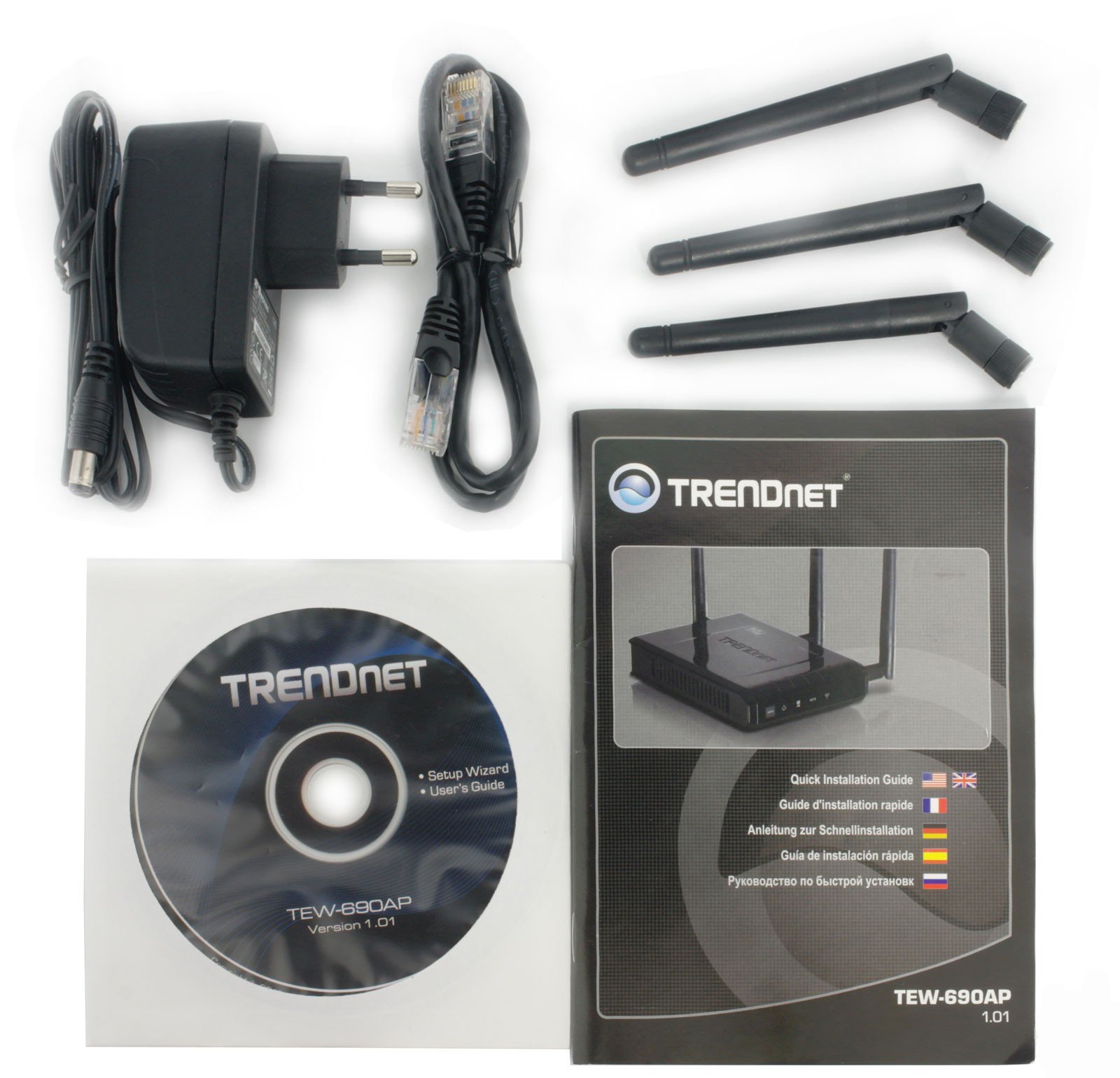 Комплектация TRENDNET TEW-690AP полностью стандартна, но учитывая возможности данного устройства, такой набор компонентов можно назвать полноценным. Он позволит обеспечить все возможные варианты использования данной точки доступа.