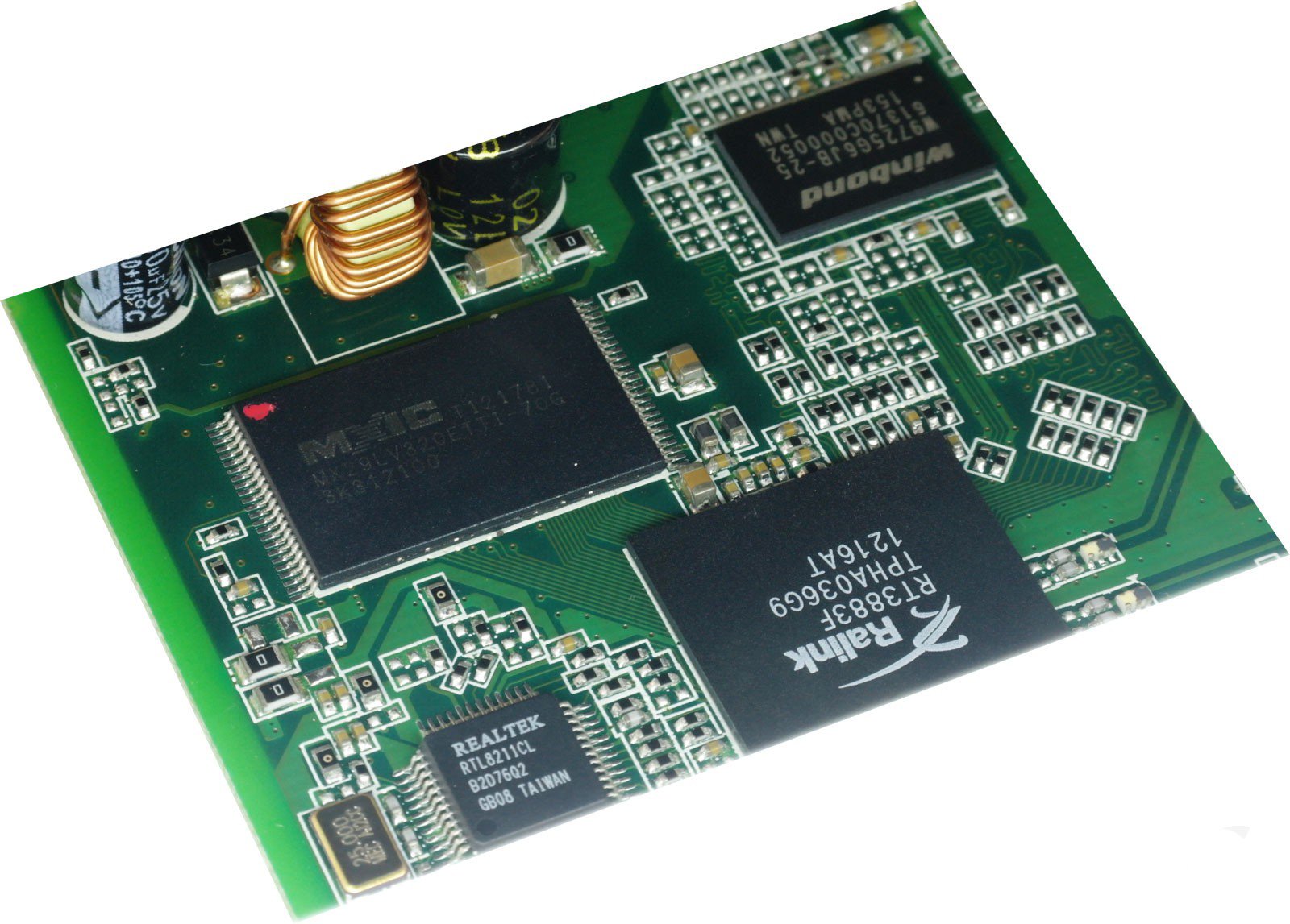 В виду частого интереса наших читателей к основным компонентам элементной базы тестируемых сетевых устройств, мы разобрали и уделили внимание внутренней комплектации этой модели. Текстолит платы вполне соответствует корпусу: выглядит очень компактно и в то же время просто.
