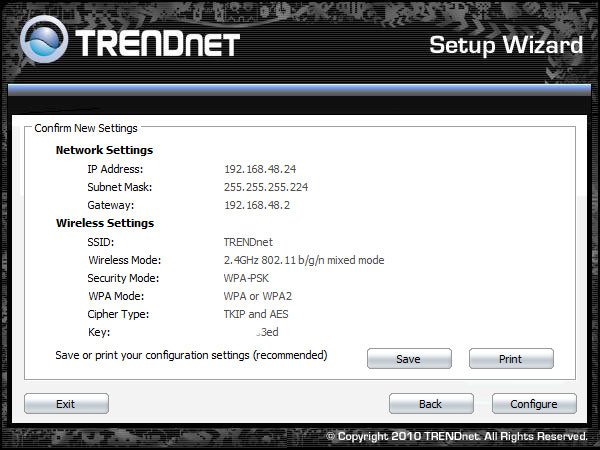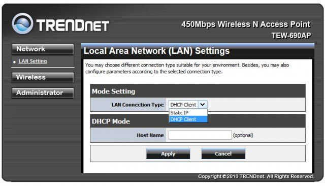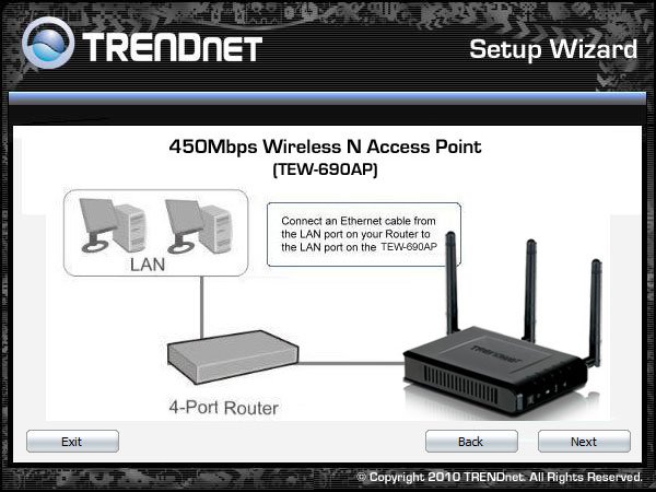 Подключение и конфигурирование TRENDnet TEW-690AP осуществляется с помощью мастера настройки, который на английском языке проведет вас через несколько простых шагов на пути к заветному беспроводному интернету.