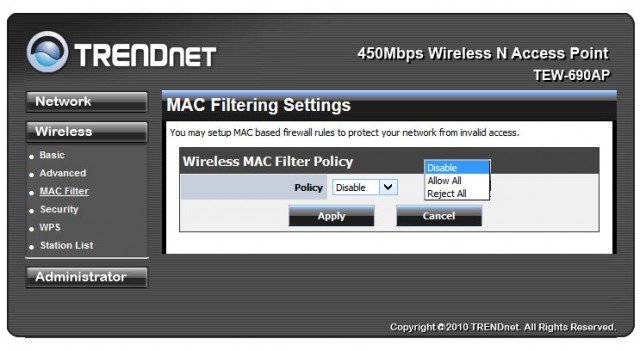 Модель TRENDnet TEW-690AP поддерживает ограничение доступа для подключения к ней и фильтрацию МАС-адресов пользователей. Можно создать списки физических адресов, для которых можно разрешить либо запретить доступ.