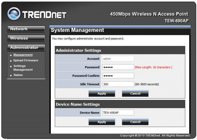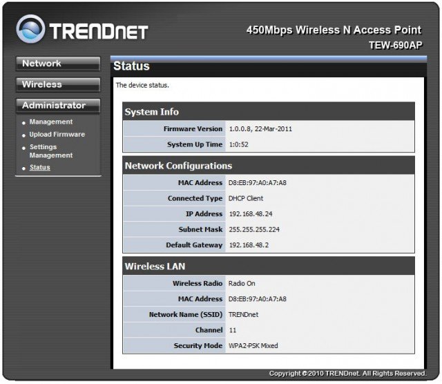 Все современные сетевые устройства для домашней сети или сети малого офиса оснащаются удобным и простым WEB-интерфейсом настройки. Для активации такового на TRENDnet TEW-690AP пользователю понадобится подсоединиться к данной точке доступа через LAN-порт и набрать в любом интернет-обозревателе страничку «192.168.10.100». После этого должно открыться окно для ввода пароля и логина доступа. Сразу за ним откроется окно статуса и основных настроек данной модели.
