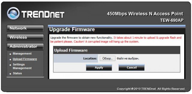 Страничка обновления прошивки устройства.