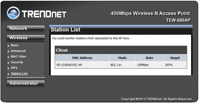 В пункте «Station List» представлен список подключившихся клиентов, уровень их сигнала и скорость соединения с ними, а также МАС-адреса.
