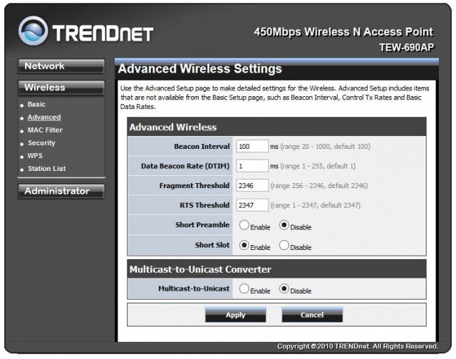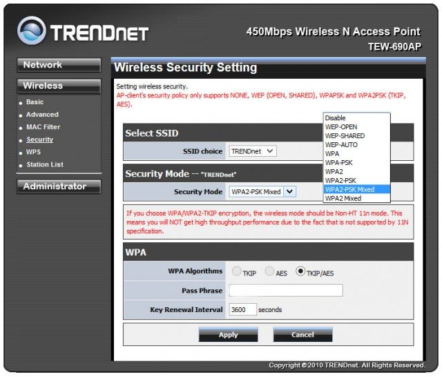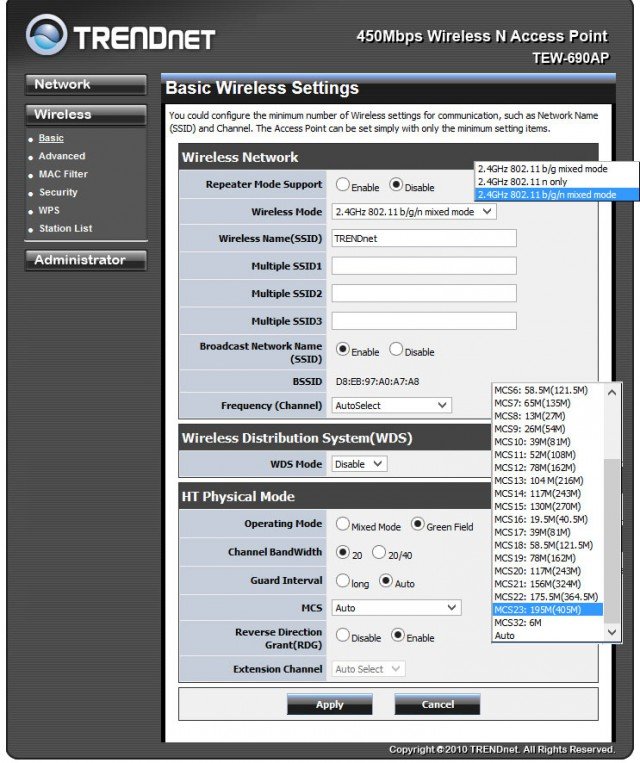 В модели TRENDnet TEW-690AP этот раздел тоже имеет достаточно серьезный набор опций.