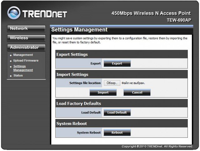Здесь находится функционал сохранения текущих настроек на компьютер пользователя и восстановление настроек из сохраненного файла, ручной перезагрузки точки доступа и восстановления заводских настроек.