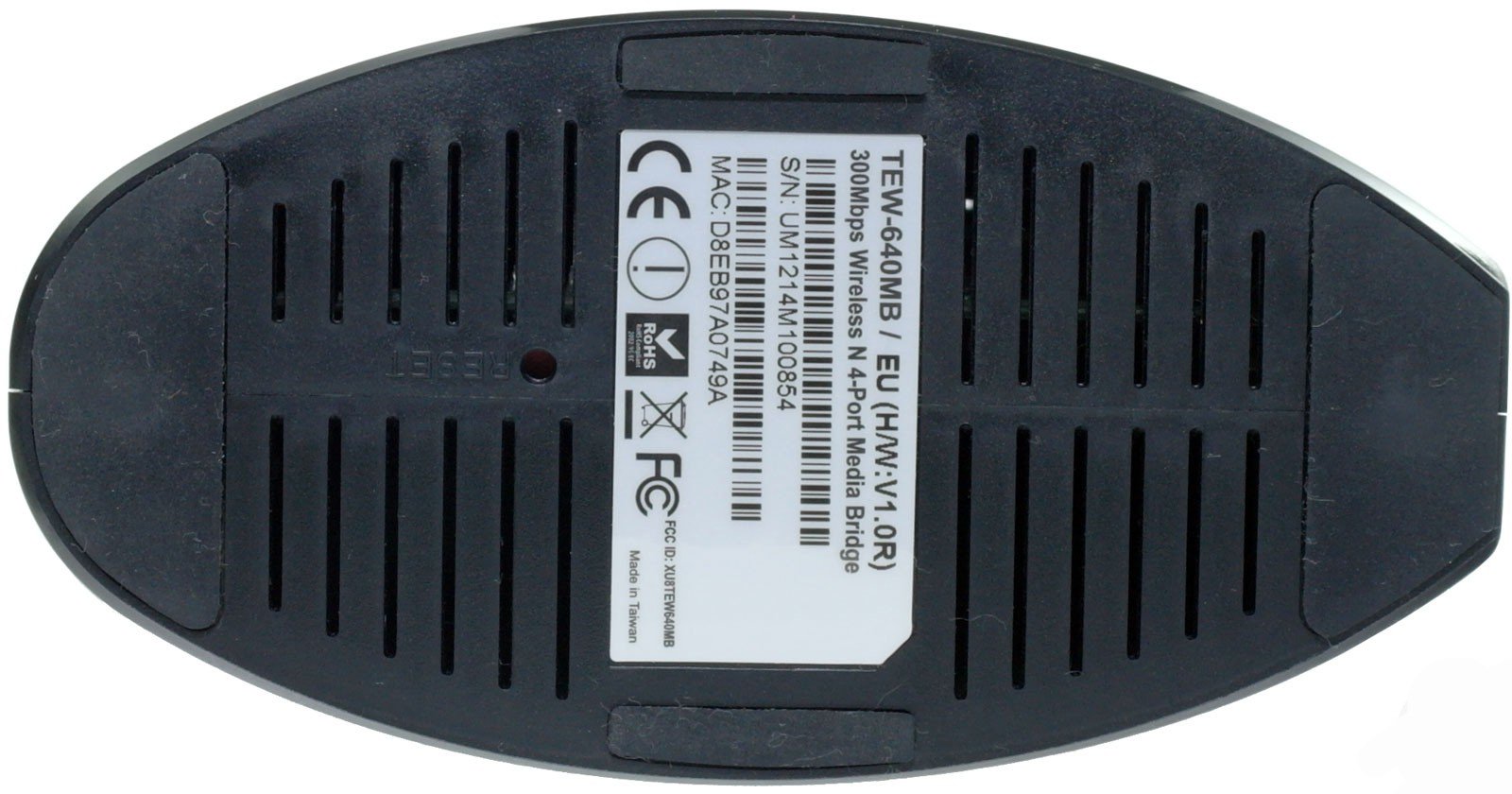 В основании TRENDnet TEW-640MB имеется решетка вентиляции. Еще одной немаловажной деталью здесь будет кнопка «RESET», которая поможет перегрузить устройство и сбросить его настройки до предустановленных на заводе. Также здесь приклеены четыре резиновые ножки для стабильной установки на горизонтальной поверхности. Стоит отметить относительную компактность и элегантность исполнения этой модели, что сразу привлекает внимание и позволяет надеяться на популярность этого решения у ценителей оригинальных форм.