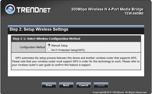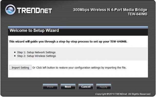 В комплекте поставки модели TRENDnet TEW-640MB присутствует компакт-диск с документацией на многих языках и ссылкой на регистрацию на сайте компании. Также, для облегчения настройки, эта модель получила кнопку WPS для автоматического подключения к беспроводному каналу, и достаточно понятный WEB-интерфейс. Но главной особенностью здесь станет удобный и простой для понимания пошаговый WEB-алгоритм настройки. С его помощью будет несложно установить и настроить TRENDnet TEW-640MB.