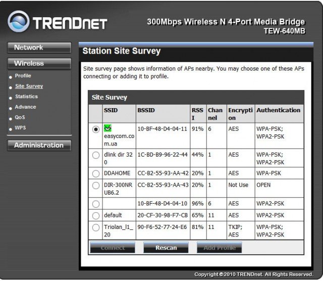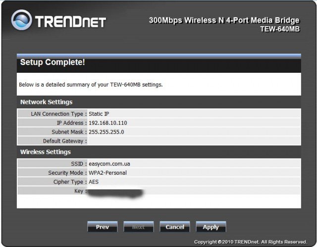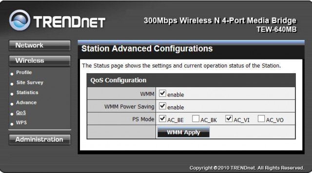По общему впечатлению данное решение вышло очень простым в настройке и при этом не потеряло необходимых для целевого использования функций. Модель TRENDnet TEW-640MB имеет полный функционал, характерный для работы в рамках возможностей Wi-Fi клиента.