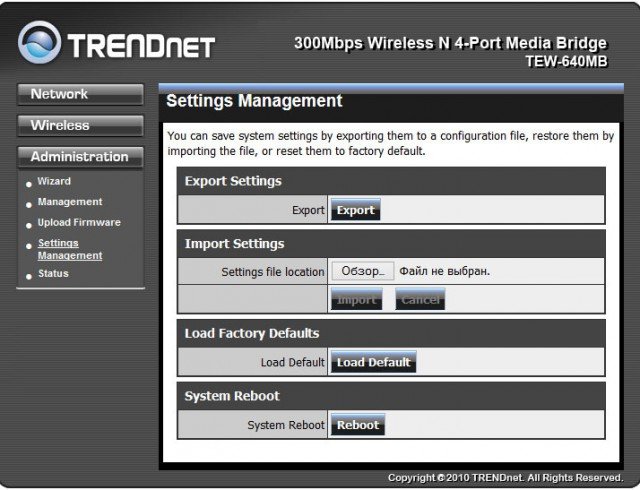 Здесь можно импортировать, экспортировать, сохранять настройки или перезагрузить устройство.