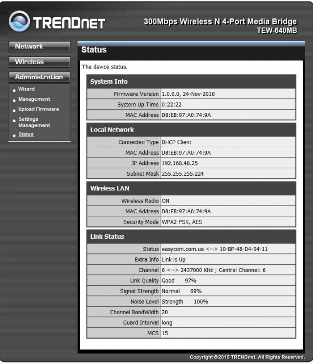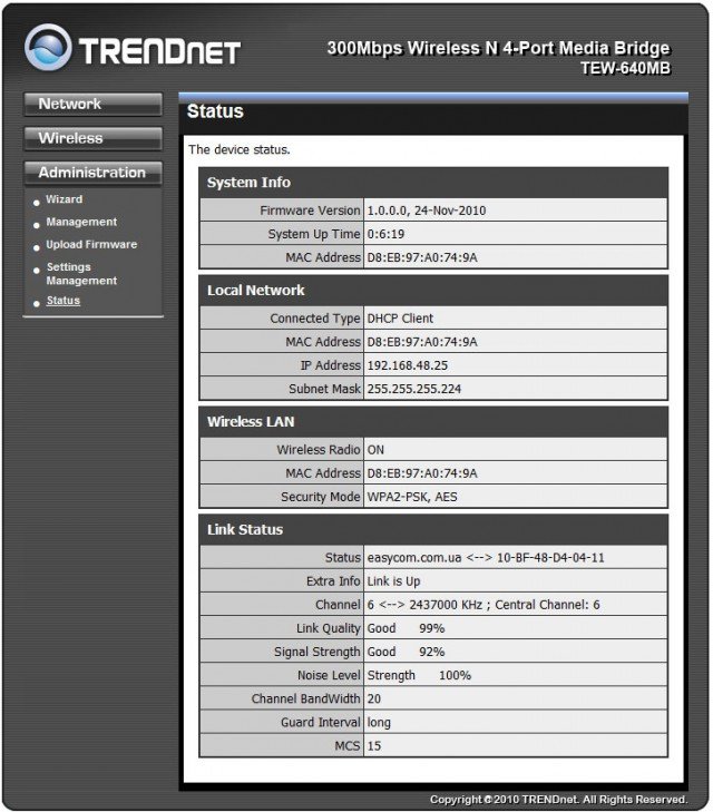 Уже описанное нами ранее окно статуса рабочих режимов модели TRENDnet TEW-640MB.
