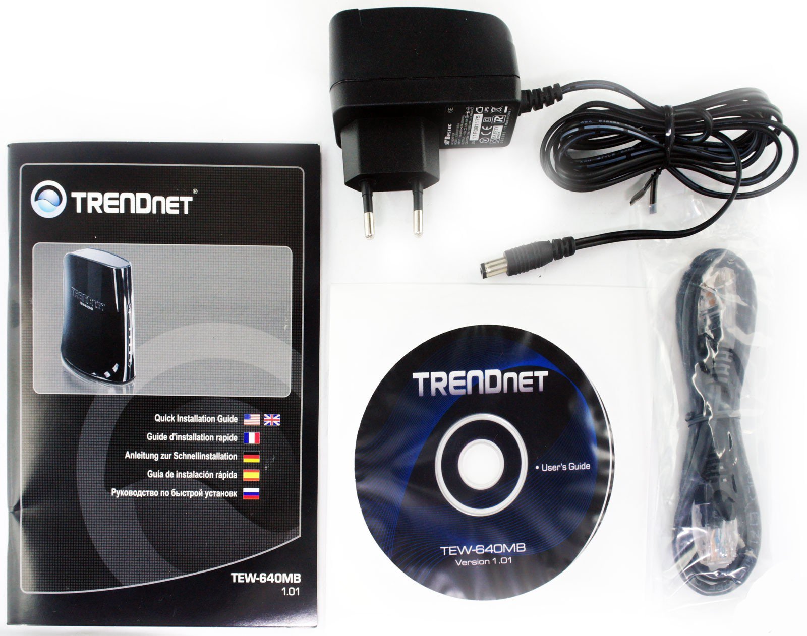 Комплектация модели TRENDnet TEW-640MB с первого взгляда может показаться минимальной. Однако наличие единственного дополнительного элемента, сетевого кабеля, является достаточным, чтобы назвать её нормальной или соответствующей среднестатистическому использованию любого подобного решения. Остальные элементы, такие как блок питания, диск и небольшая книжка-инструкция являются неотъемлемой частью, которая просто необходима для работы или первого включения данной модели.