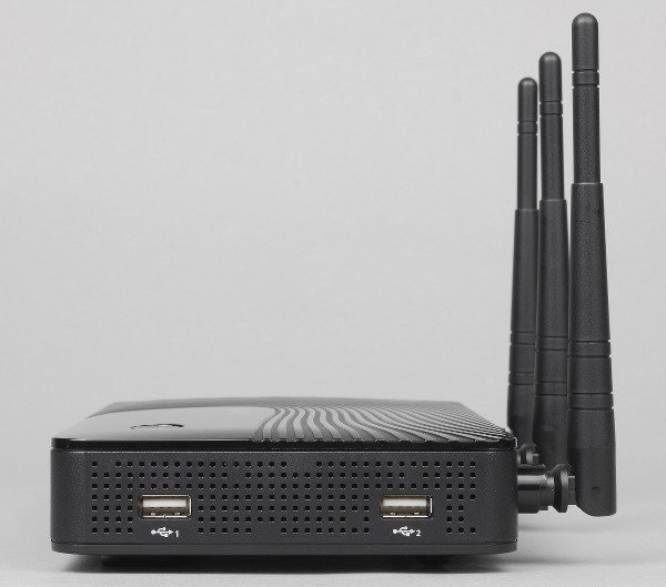 Дно также глянцевое и покрыто отверстиями для пассивной вентиляции начинки устройства. Также решетки есть и на боковых торцах (их покрытие уже матовое). На правом боку установлены два порта USB 2.0. Они расположены на большом расстоянии друг от друга, так что никакие, даже самые крупные модемы, не будут блокировать второй порт.