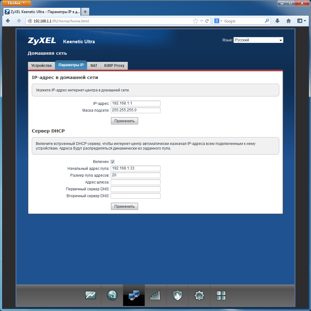 Следом идет «Домашняя сеть», где указываются данные локального сегмента сети, в том числе собственный IP-адрес роутера, настройки сервера DHCP, использование NAT и опции IGMP Proxy.