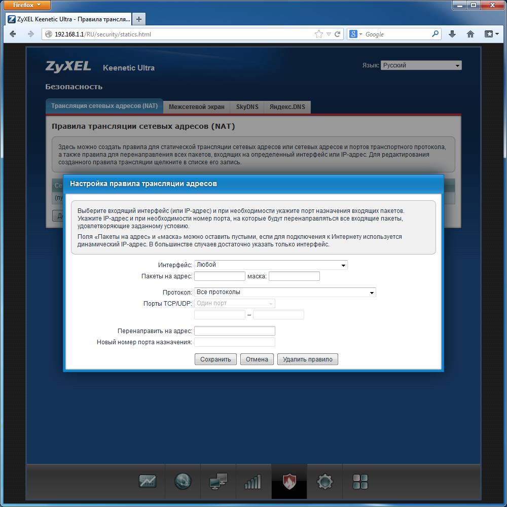 Есть встроенная поддержка протокола UPnP, отключить который можно удалением модуля. Как и для брандмауэра, есть возможность указания в правилах интерфейса. Очень полезной возможностью является поддержка сервисов SkyDNS и Яндекс.DNS. Благодаря технологиям фильтрации DNS-запросов, они могут повысить защиту ваших компьютеров и мобильных устройств от сомнительного и вредного контента. В случае Яндекс.DNS пользователь имеет возможность определить для каждого клиента свой уровень фильтрации. Аналогичная возможность есть и на платных аккаунтах SkyDNS.