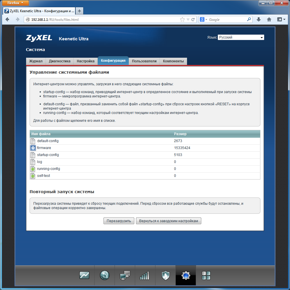 Как мы говорили выше, работа с настройками и прошивкой в данном устройства реализована нестандартно. В частности, конфигурация представлена в виде системного файла, который можно скачать или заменить.