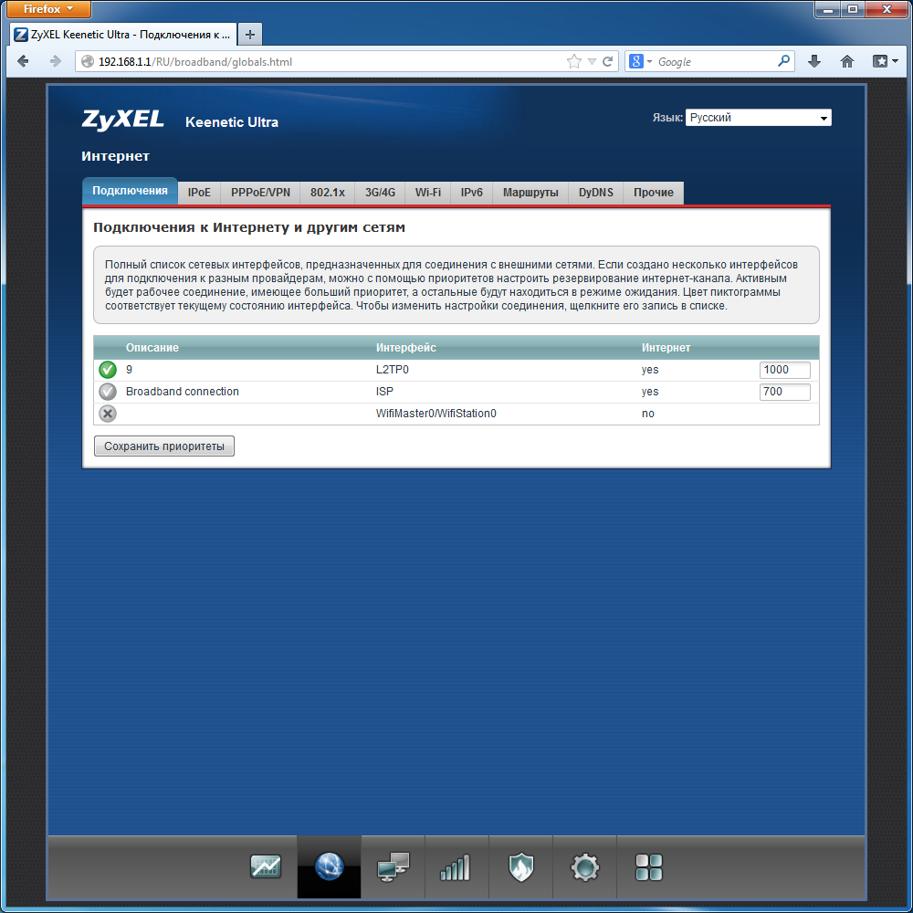 Группа «Интернет» собрала все параметры подключения к глобальной сети. Новая прошивка позволяет запрограммировать одновременно несколько соединений разных типов и установить для них приоритеты.