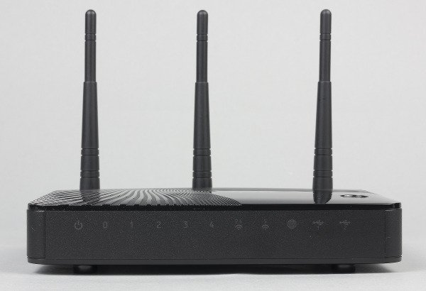 Индикаторы работы собраны на переднем торце. Здесь разместились следующие светодиоды: питание/статус, активность проводных портов, состояние беспроводных точек доступа, интернет, статус портов USB. В логотипах разобраться легко, яркость у индикаторов средняя, цвет — зеленый. Во время активности интерфейсов они мигают. Возможности определить скорость проводного подключения (100 или 1000 Мбит/с) индикаторам не предусмотрено, но при необходимости можно узнать эту информацию через веб-интерфейс. Опирается корпус на две резиновые и две пластиковые ножки. Последние по совместительству используются и для крепления роутера на стену. Вариант ориентации только один — антеннами вниз.