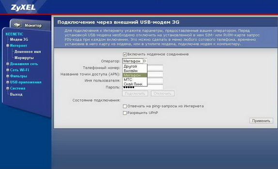 Модем от мегафона также заработал вообще без проблем, благо в роутере есть набор настроек для всех основных операторов мобильной связи в Москве.