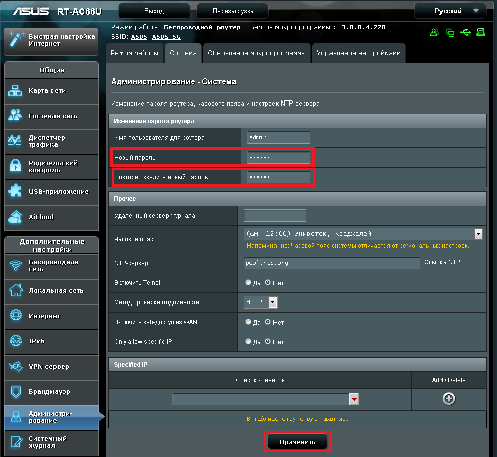 В целях безопасности рекомендуется сменить заводской пароль. По умолчанию: Логин admin, пароль admin. В интерфейсе роутера необходимо зайти во вкладку «Администрирование», далее Система. В поле «Новый пароль» введите новый пароль, в поле «Повторно введите новый пароль» введите новый пароль ещё раз." Ниже будет кнопка применить.