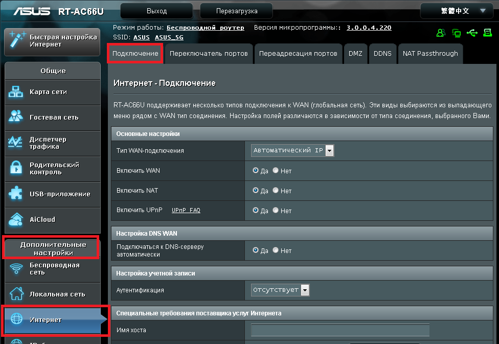 В интерфейсе роутера необходимо выбрать вкладку слева «Дополнительные настройки» — «Интернет» — «Подключение».