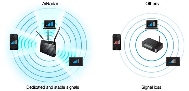 Технология ASUS AiRadar служит для увеличения зоны покрытия сети Wi-Fi. Интеллектуально определяя расположение подключенных устройств, RT-AC68U преобразует слабый всенаправленный сигнал в сильный однонаправленный, что обеспечивает более высокую скорость передачи данных.