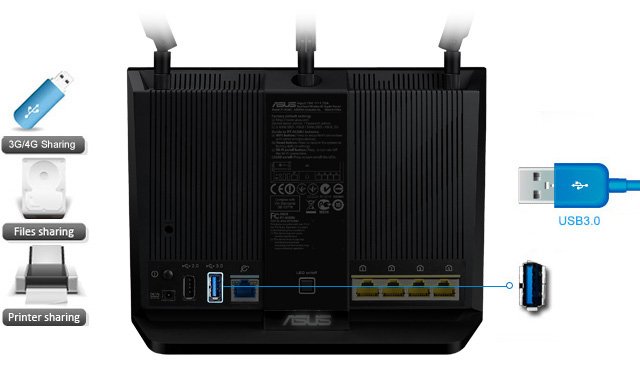 RT-AC68U оснащается двумя портами USB, один из которых соответствует новому высокоскоростному стандарту USB 3.0. Подключив к ним USB-совместимые устройства, можно легко превратить данный маршрутизатор в файл-, принт- или 3G/4G-сервер.