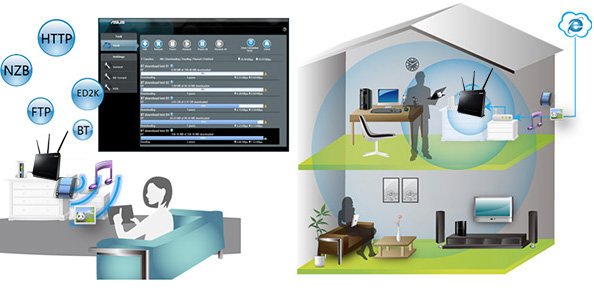 Встроенная система автономной загрузки файлов Download Master позволяет скачивать файлы из интернета на подключенный по USB внешний жесткий диск без использования компьютера, причем пользователь может управлять загрузками и проверять их статус удаленно. Затем, пользуясь встроенным медиасервером, файлы с внешнего диска можно будет транслировать на любом совместимом устройстве, будь то компьютер, игровая приставка или телевизор.