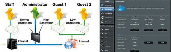 С помощью RT-AC68U можно организовать до трех беспроводных сетей в каждом из частотных диапазонов (2,4 ГГц и 5 ГГц) и для каждой из них задать индивидуальные права доступа, расписание работы и другие параметры.